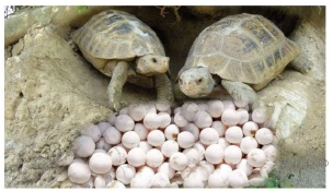 На фотографии изображена пара черепах с кладкой яиц.